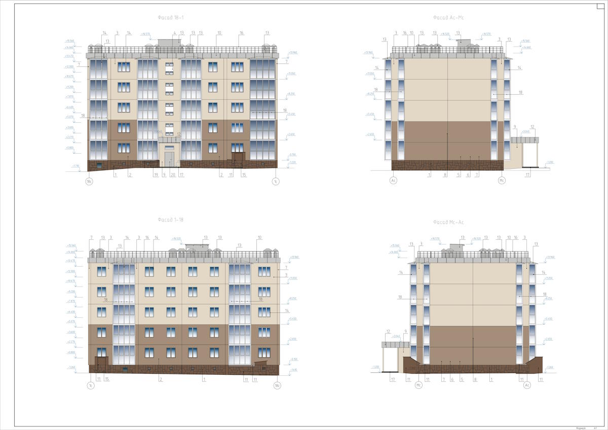 На первом и типовых этажах здания запроектировано по 6 квартир в каждом подъезда, из них три однокомнатных и три двухкомнатных квартиры. В составе каждой однокомнатной квартиры гостиная, кухня, прихожая, раздельный санузел. В составе двухкомнатных квартир гостиная, спальня, кухня, прихожая, раздельный санузел.